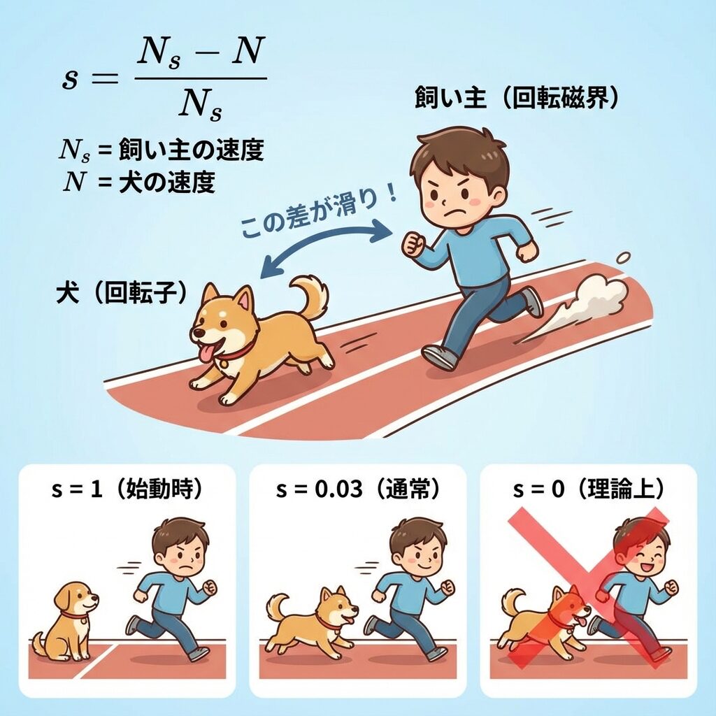 飼い主(回転磁界)が時速10kmで走り、犬(回転子)が時速9.5kmで追いかける。この「追いつけない度合い」が滑り。犬は飼い主より5%遅い → 滑りs = 0.05(5%)