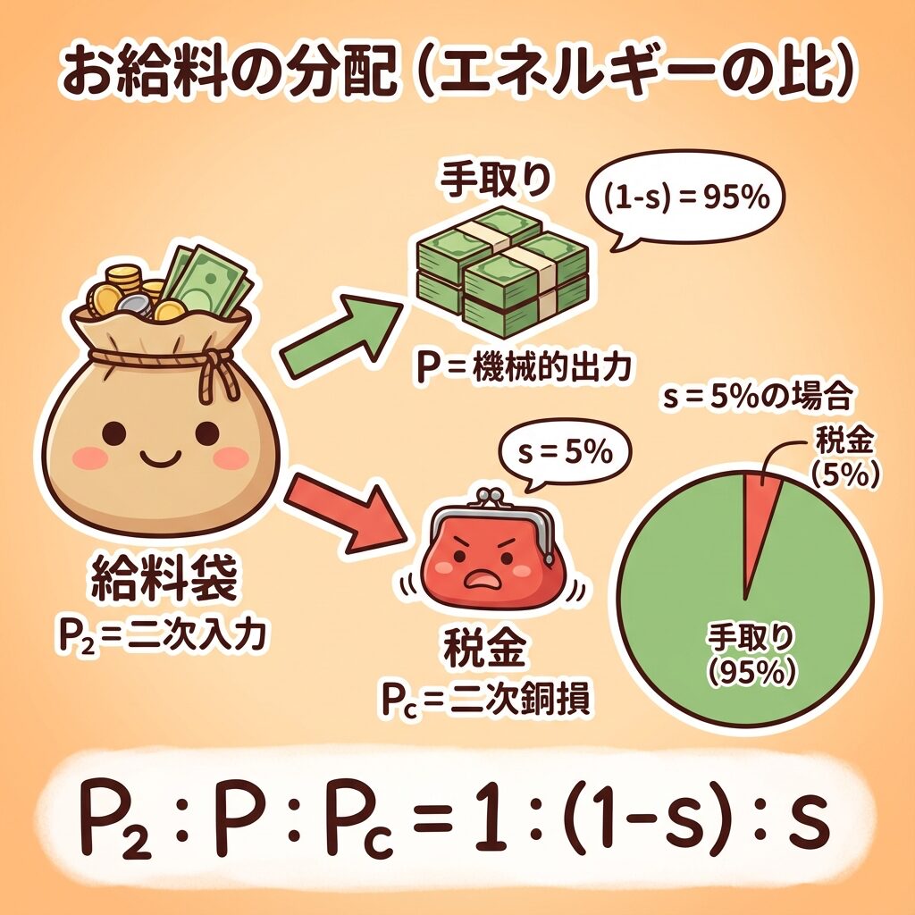 ケーキ(P₂)を切り分けるイメージ。滑りs = 5%なら、95%が手取り(P)で、5%が税金(Pc)に取られる。滑りが大きいほど、損失が増えて効率が悪くなる!