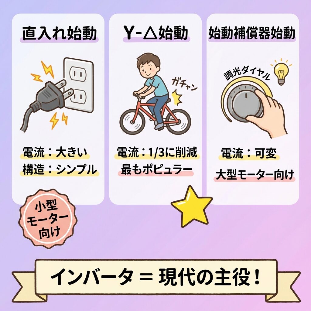 ⚠️ 問題点:大電流が流れると、電圧降下や電源への負担が発生。大型モーターでは始動法の工夫が必要!