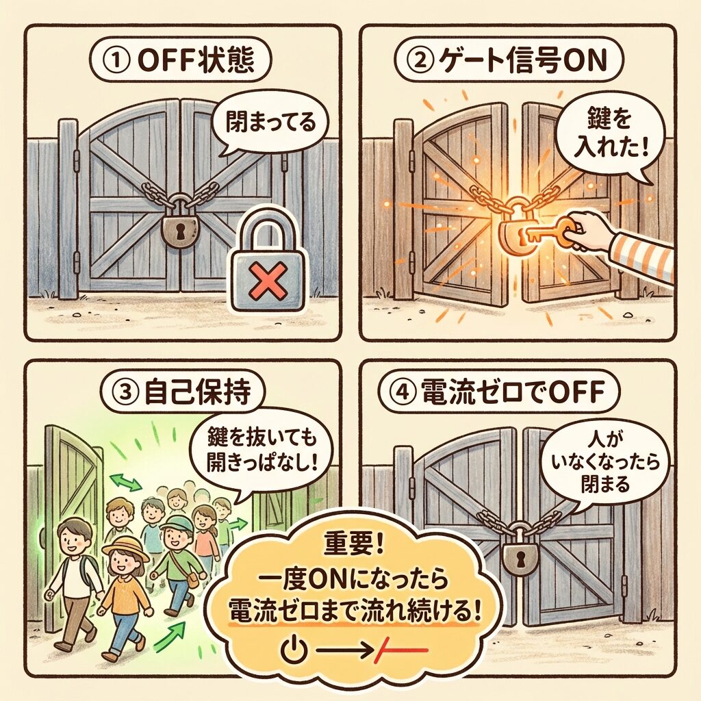 - 一度ONになると、電流がゼロになるまで流れ続ける