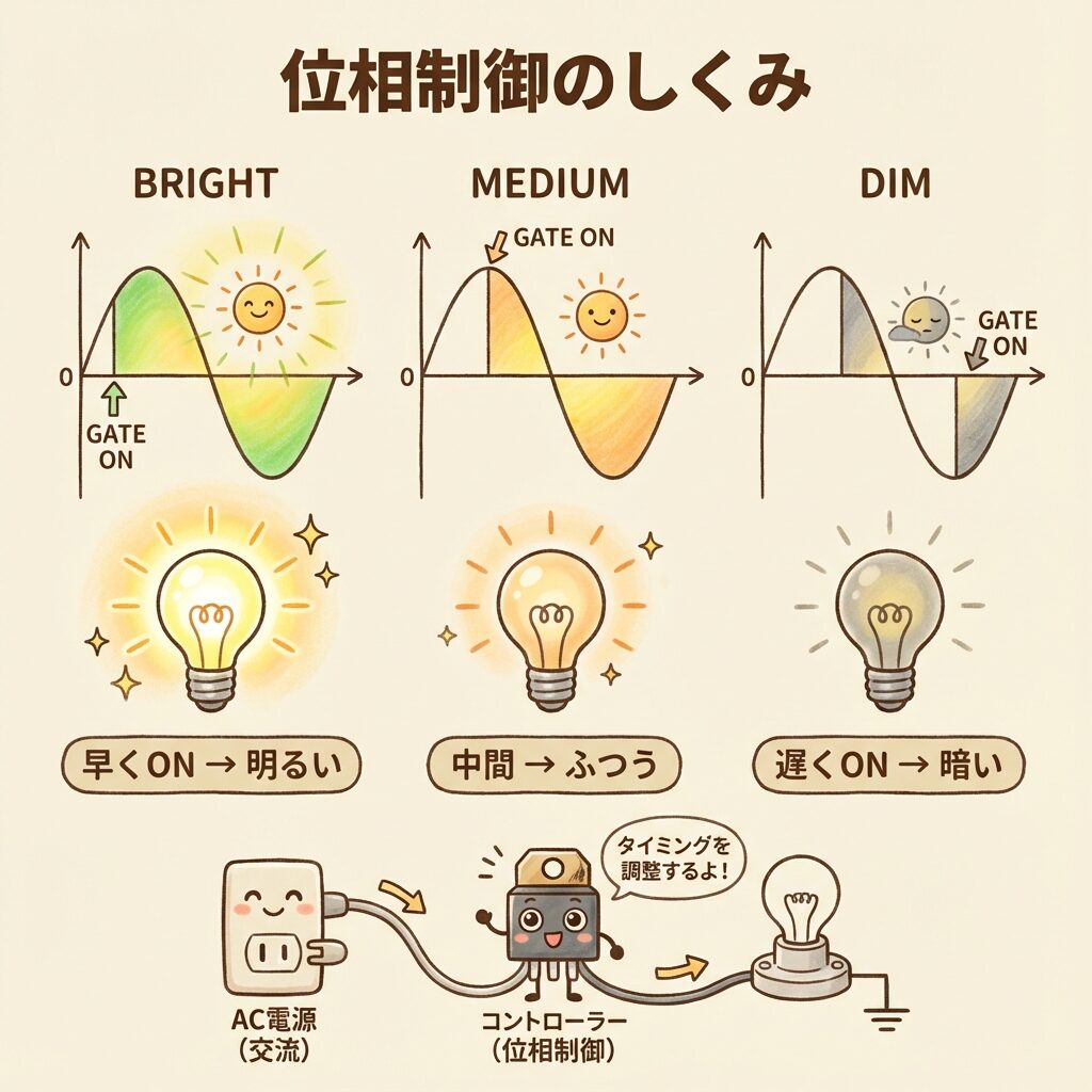 交流の波が来るたびに、「どのタイミングでゲート信号を入れるか」を調整します。