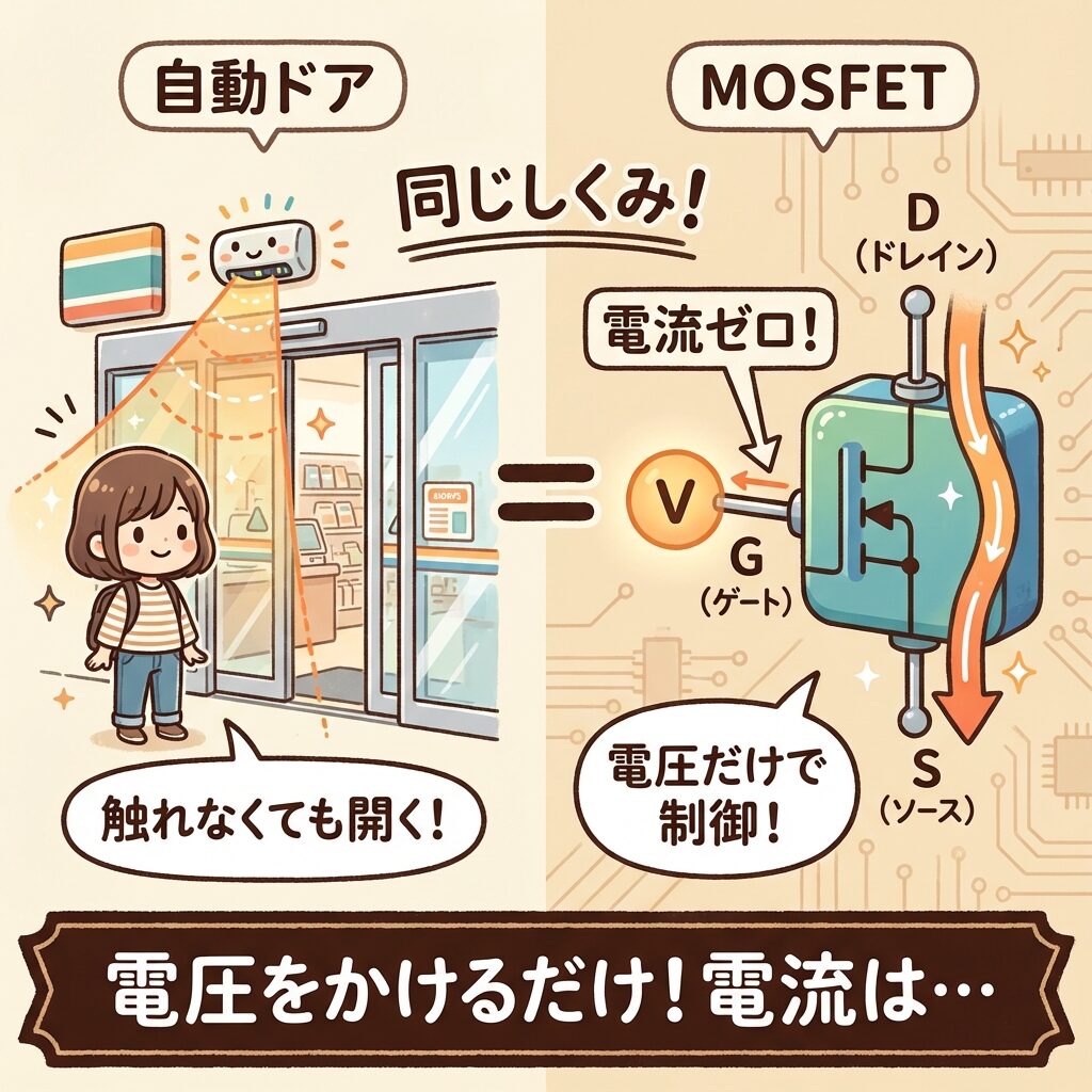 でも安心してください。MOSFETは「電圧で開く自動ドア」をイメージすれば、バッチリ理解できます!
