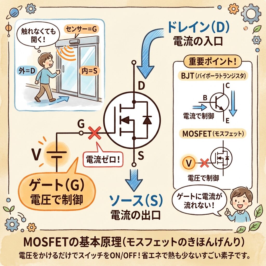 🚪 MOSFETとは?「電圧で開く自動ドア」をイメージしよう