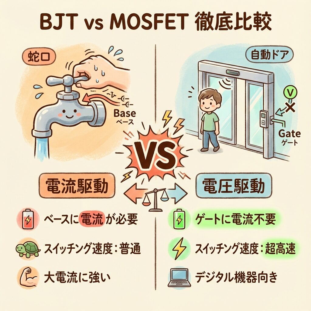 - MOSFETは「電圧駆動」、BJTは「電流駆動」← 超頻出!