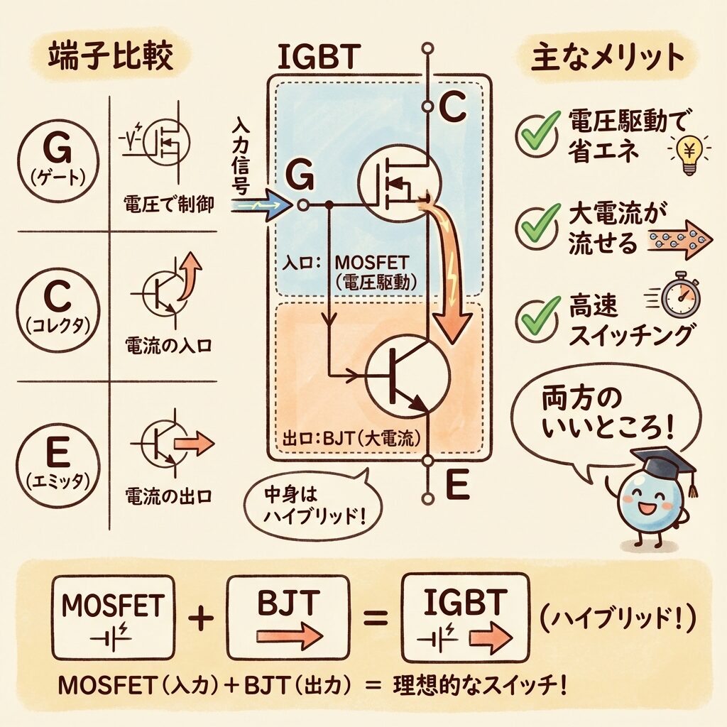 見てください!ゲートはMOSFET由来、コレクタ・エミッタはBJT由来です。まさに「いいとこ取り」の証拠ですね。