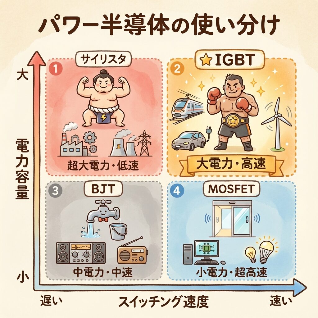 | 🤝 IGBT | いいとこ取り(電圧駆動+大電力) |