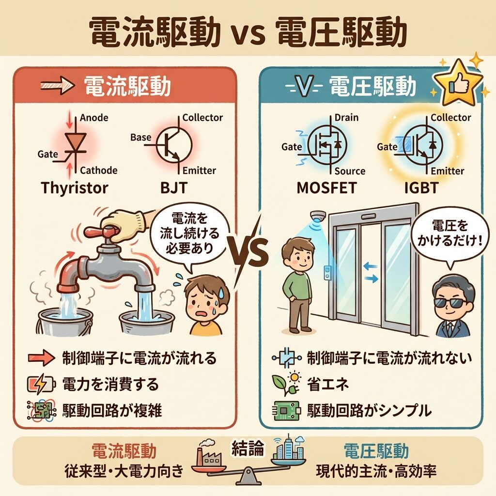 電流駆動:サイリスタ、BJT(ベースに電流を流して制御)