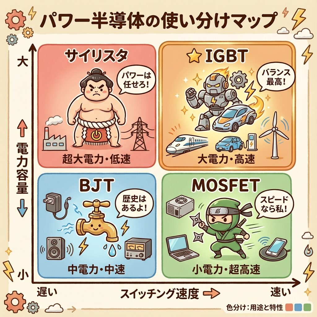 | 🤝 IGBT | 大電力スイッチング | 電車、EV、工場設備、風力発電 |