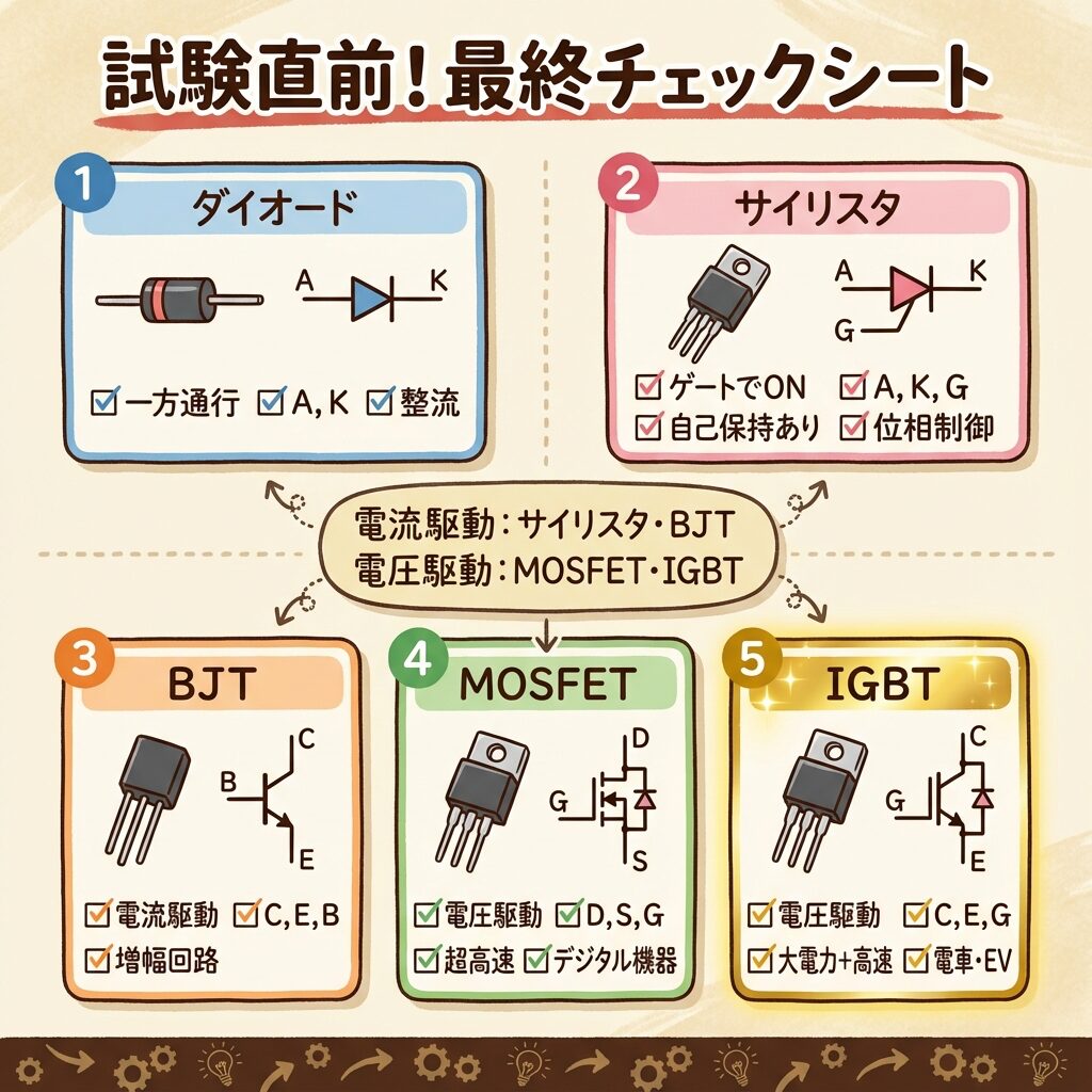 「あれ、BJTとMOSFETの違いって何だっけ?」「サイリスタの端子名は?」——そんな疑問を、この記事でスッキリ解消しましょう!