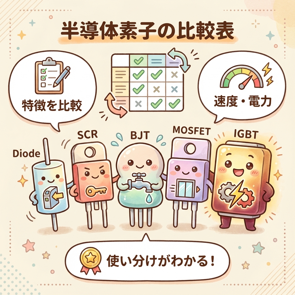 半導体素子シリーズの最終回は、これまで学んだ5つの素子を一覧で比較します。