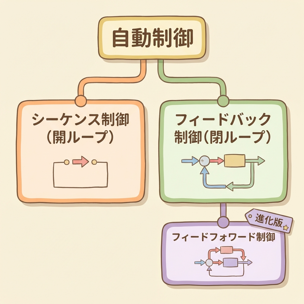 自動制御は、大きく2つ → さらに3つに分類されます。これが電験三種で問われる全体像です。