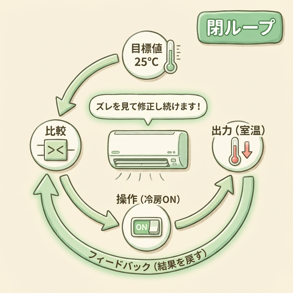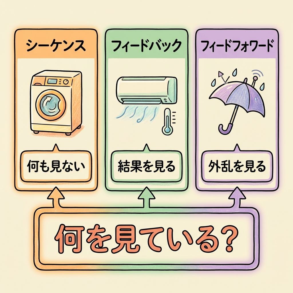 シーケンス制御との最大の違いは、結果を見て調整するかどうかです。洗濯機は結果を見ない。エアコンは結果を見続ける。この違いだけ覚えれば十分です。