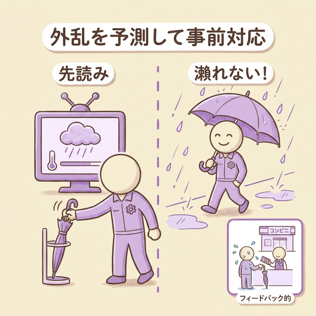 天気予報で雨を予測(外乱を事前検知)→ 傘を持って出かける → 雨が降っても濡れない
