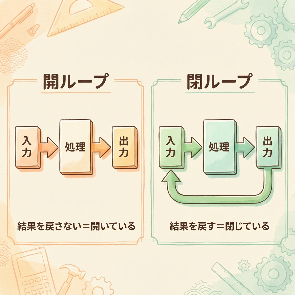 電験三種の問題文では、「開ループ制御」「閉ループ制御」という用語もよく出てきます。これも3秒で理解できます。