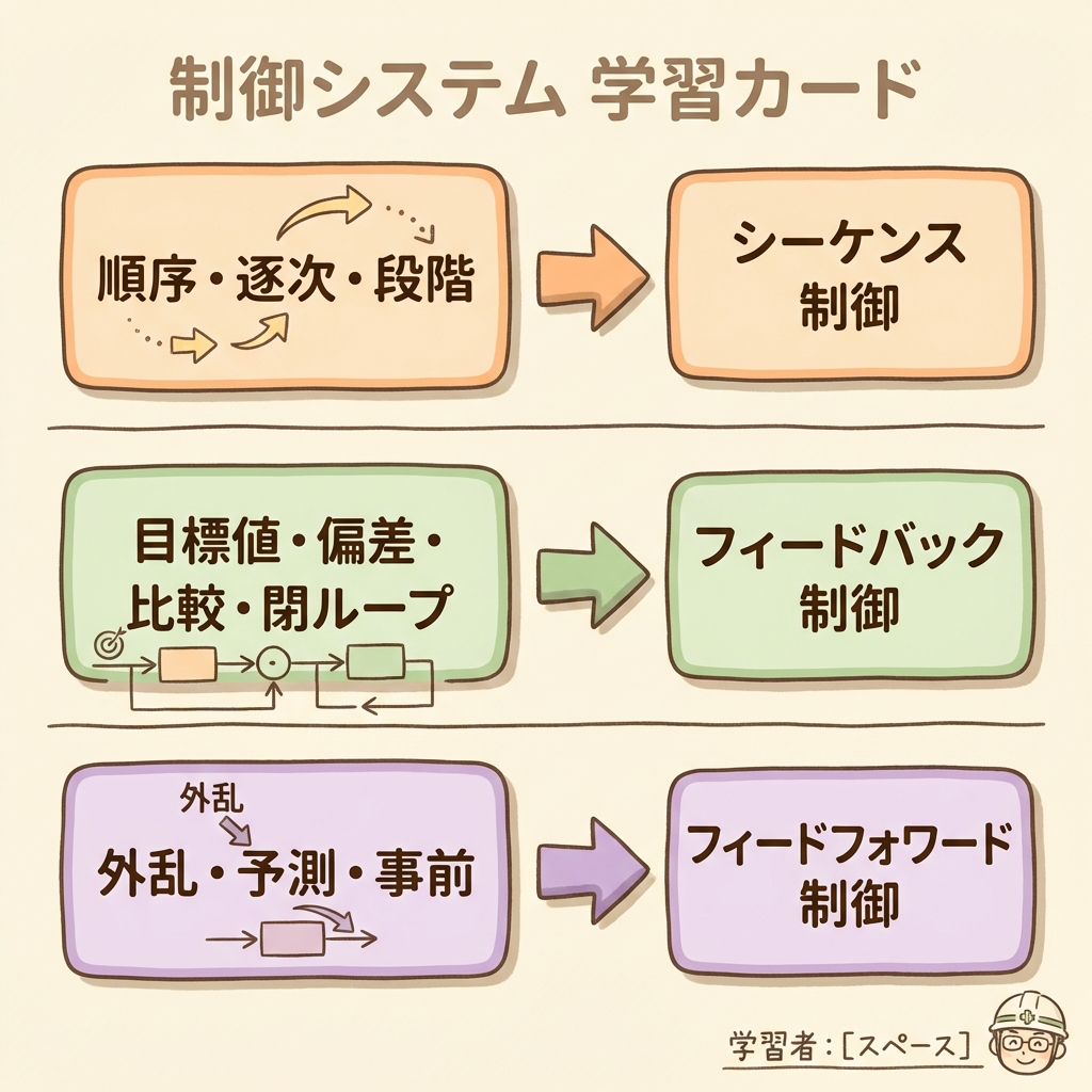 - 3つの制御方式(シーケンス・フィードバック・フィードフォワード)の違いを身近な家電と日常行動で完全に区別