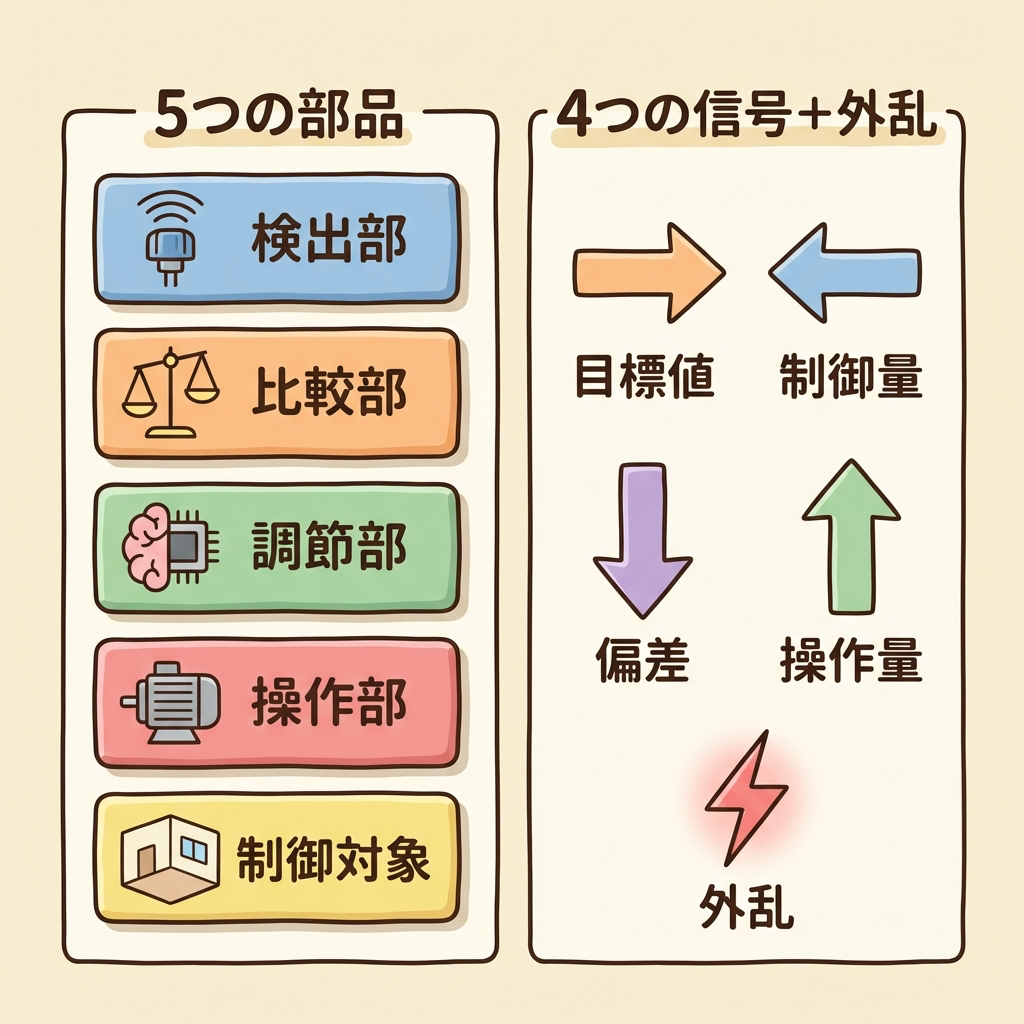 検出部(センサー)→ 比較部(ズレを計算)→ 調節部(指示を出す)→ 操作部(実際に動く)→ 制御対象(コントロールしたいもの)