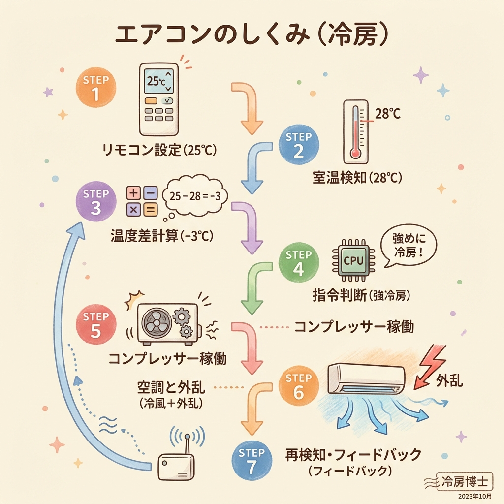 ここからが本題です。エアコンの冷房運転を例に、信号と構成要素が実際にどう動くかを順番に追っていきます。