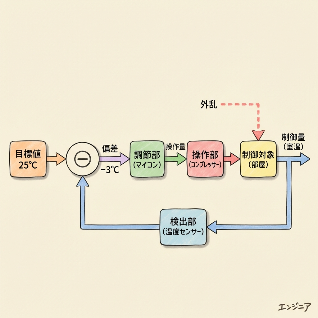| 目標値 | ブロック図の一番左(入力側) | 設定温度 25℃ | 人間が決める「ゴール」 |