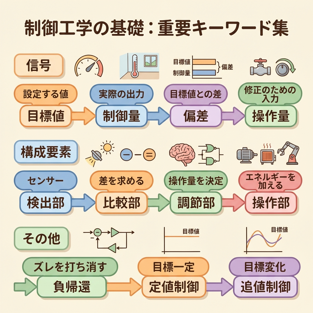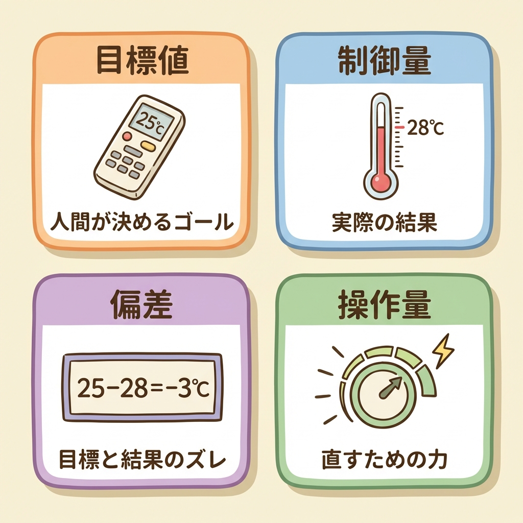 - 「目標値」「偏差」「操作量」「制御量」「外乱」の違いを30秒で区別できるようになる