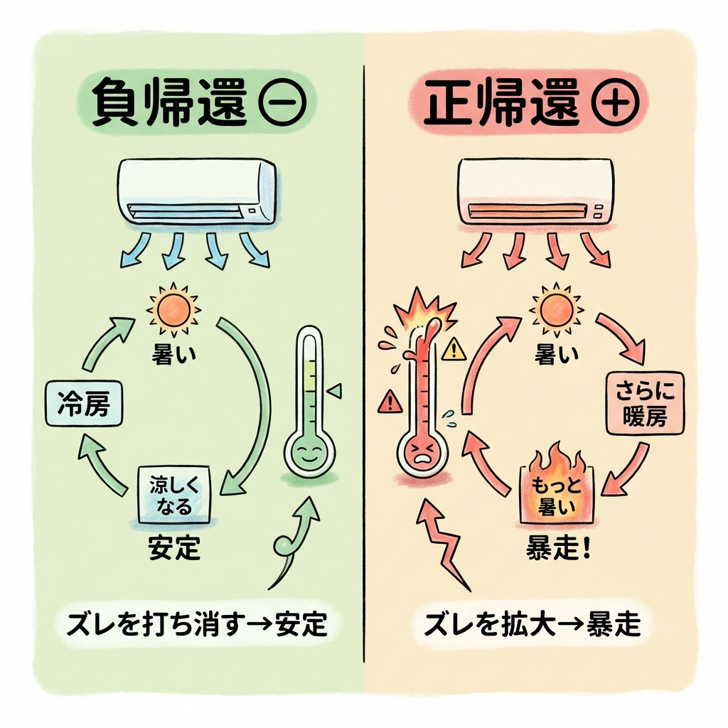 | 負帰還(ネガティブフィードバック) | ズレを打ち消す方向にフィードバックすること。フィードバック制御の基本 |