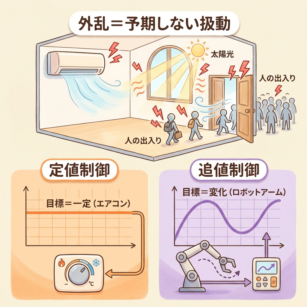 窓を開けた、人が増えた、直射日光が差し込んだ──こうした想定外の変化が、制御対象に直接影響を与えます。これが「外乱」です。