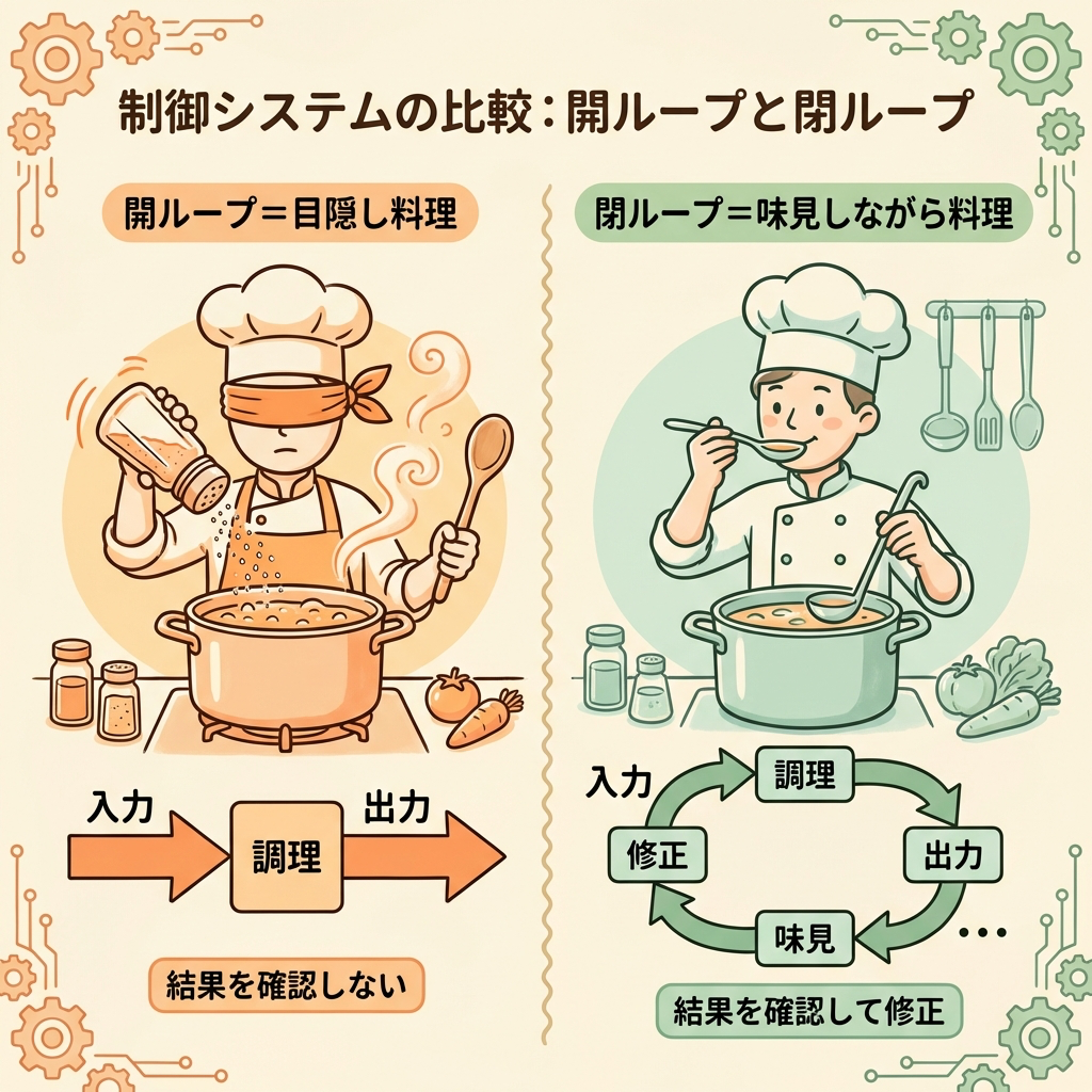 開ループ制御は、結果を確認しないまま動き続けるので、ズレが起きても気づけません。