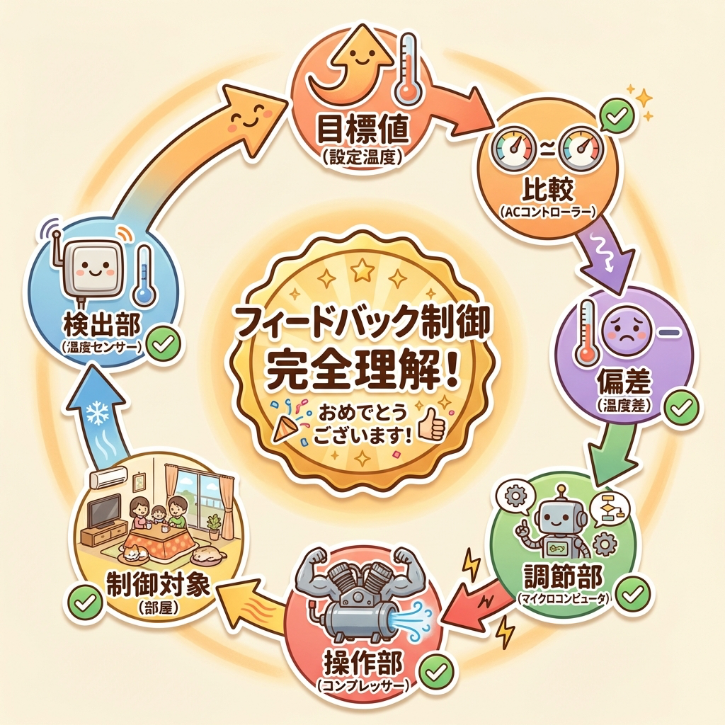 この7ステップは、フィードバック制御がある限り永遠に繰り返されます。エアコンが動いている間ずっと、「測る → 比べる → 決める → 動かす → 測る → …」が止まりません。これが「閉ループ」と呼ばれる理由です。