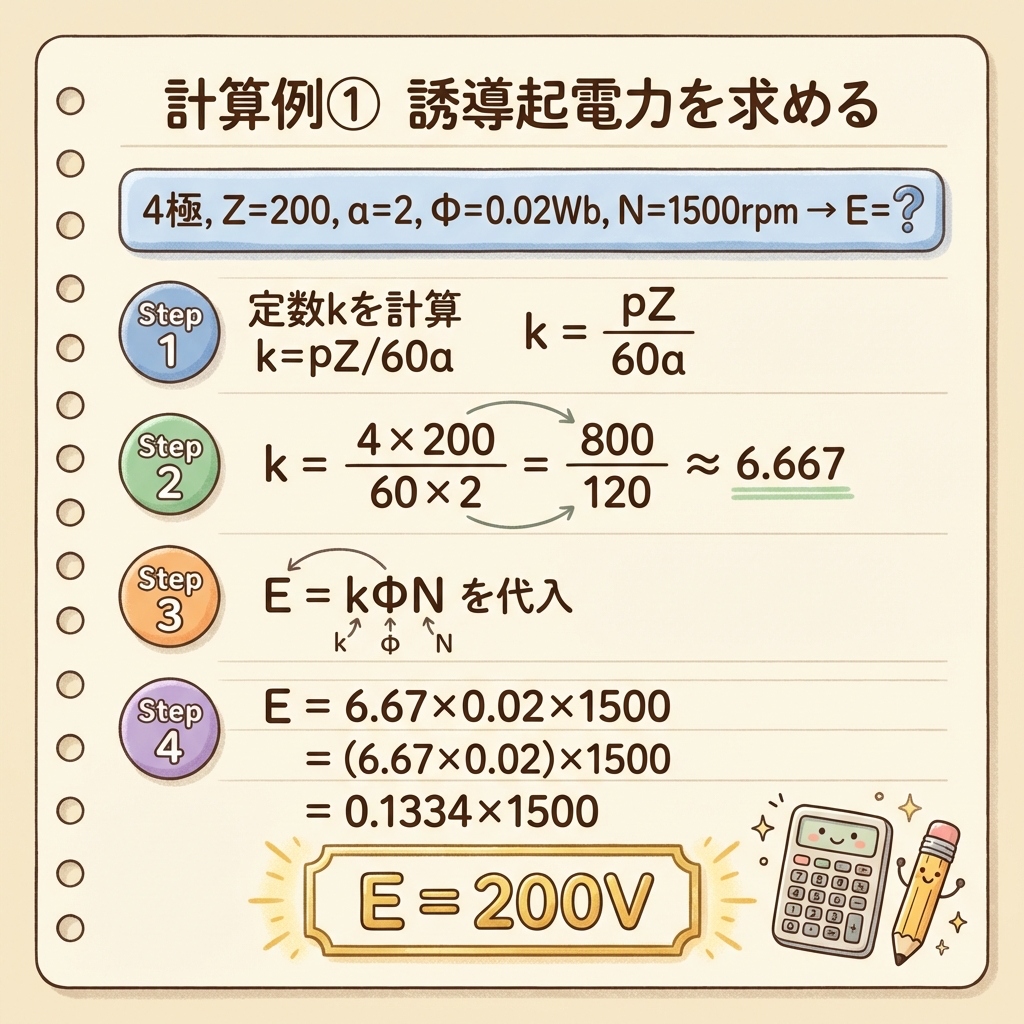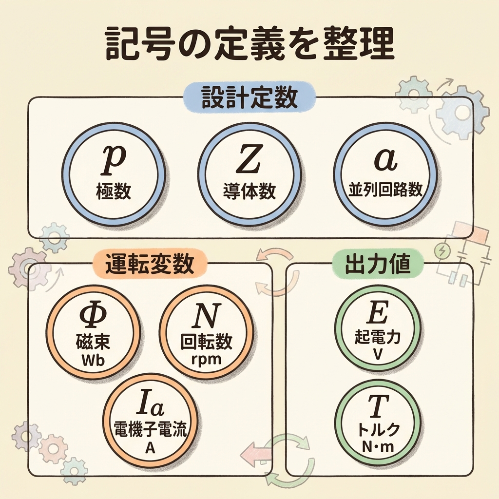 p, Z, a は直流機の「設計仕様」として最初から決まっている値です。一方、Φ, N, Ia運転中に変化しうる値です。公式を使うとき「どれが定数で、どれが変数か」を意識するだけで、問題の見通しがグッと良くなります。