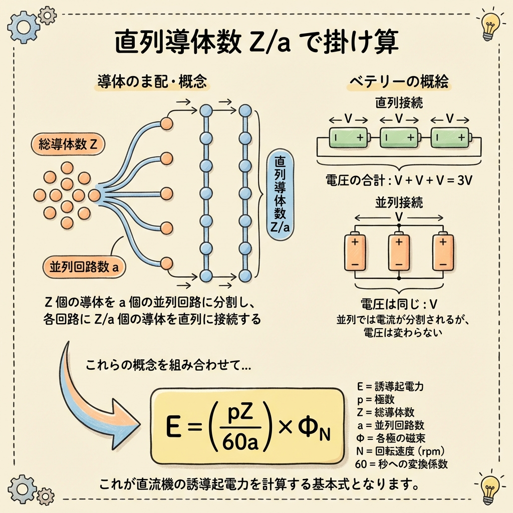 電機子にはZ本の導体がありますが、並列回路数 a で分かれているため、直列に繋がっている導体数は Z/a 本です。