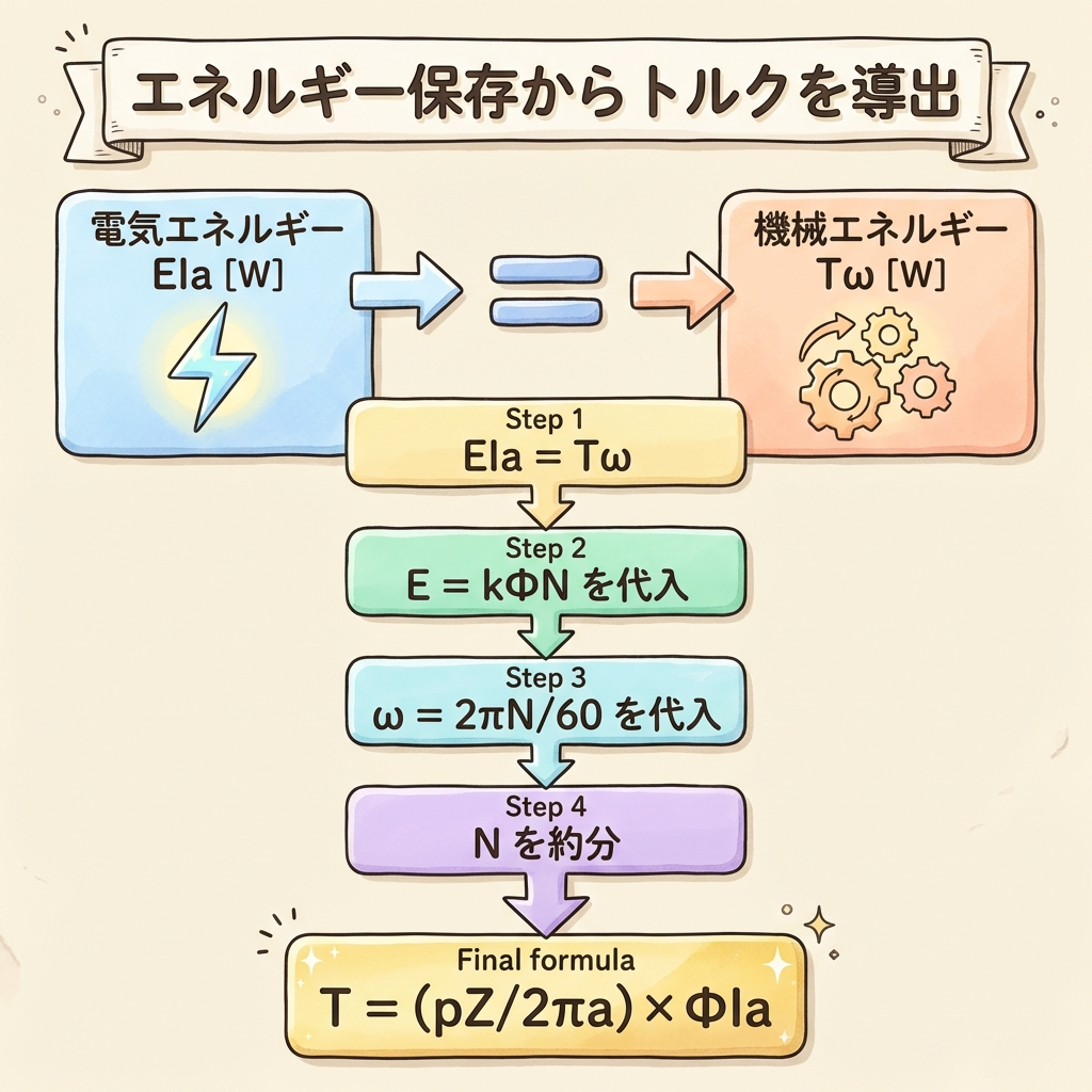 次はトルク T の公式を導出します。2つの導出方法がありますが、ここでは「エネルギー保存則(電力のバランス)」から導く方法を使います。最も直感的で、試験でも使いやすい方法です。