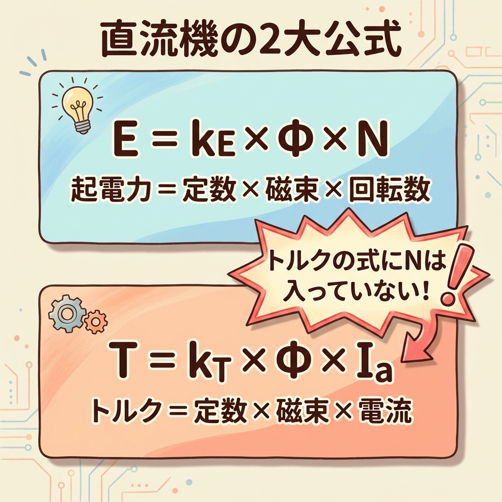 計算問題で毎回出る公式群。導出過程を省略せず、速度・トルク・電流の3者関係を1枚の図にまとめる。