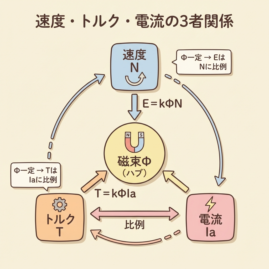 • 磁束Φ が「ハブ」:速度N・トルクT・電流Ia の3者がΦを介して結びついている