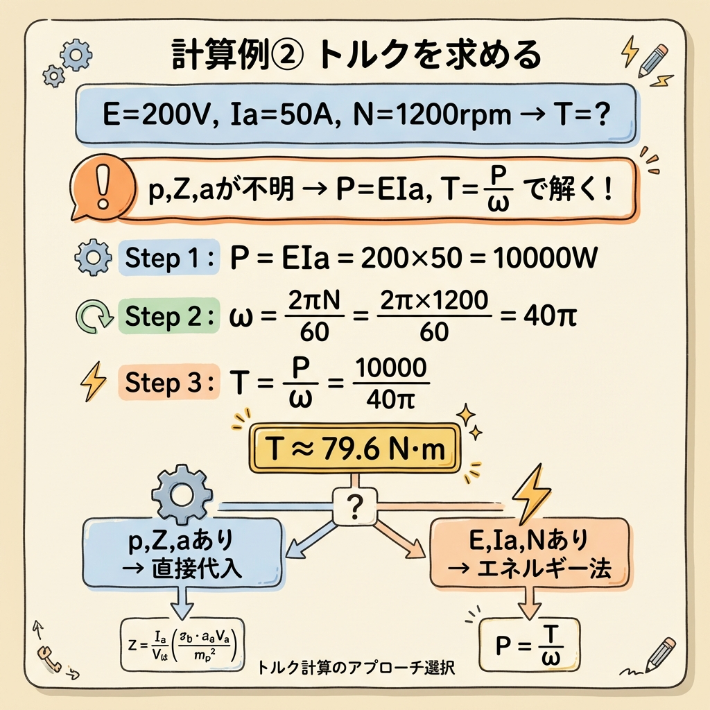 ある直流電動機の誘導起電力が E = 200 V、電機子電流が Ia = 50 A、回転数が N = 1,200 min-1 のとき、トルク T [N·m] を求めよ。