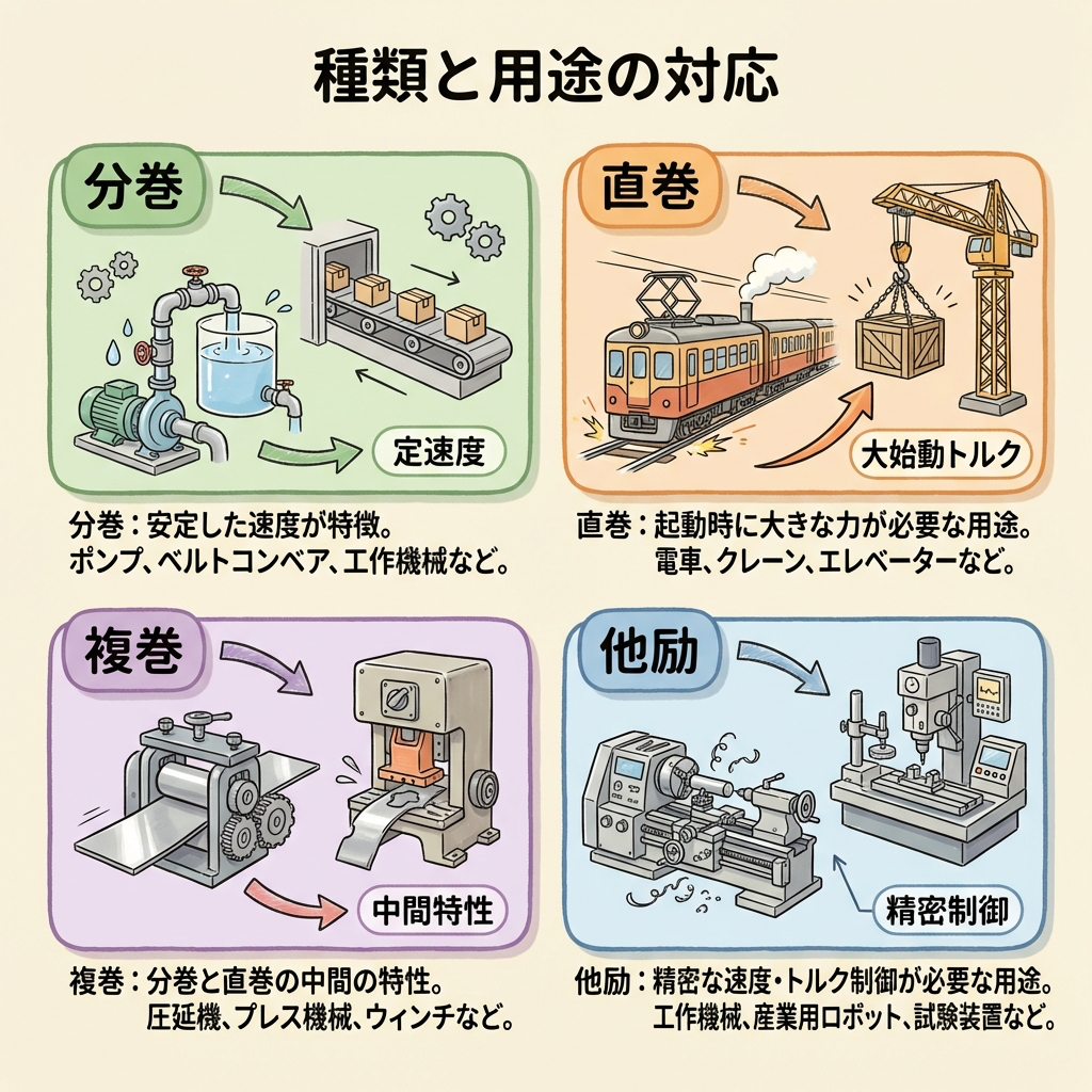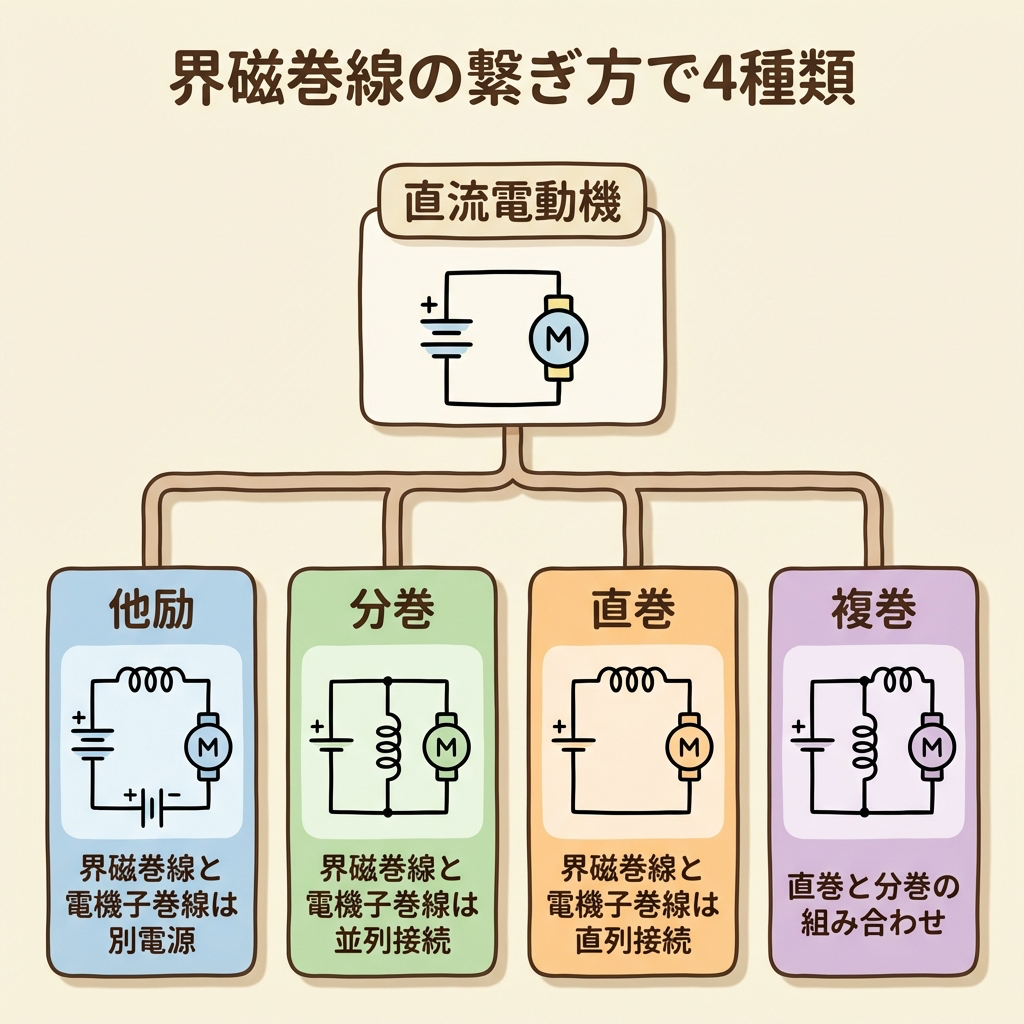 🔌 界磁巻線の繋ぎ方で4種類に分類