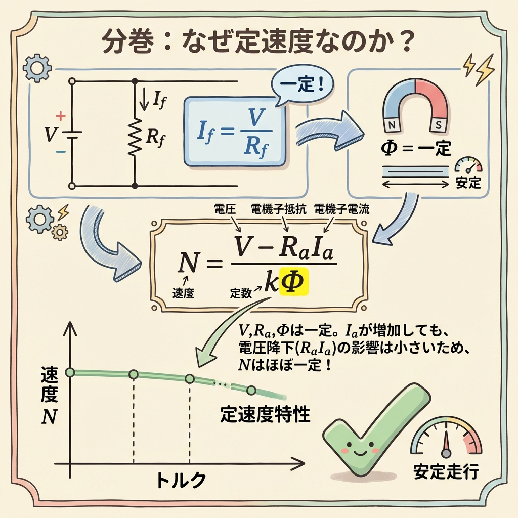 最大の特徴:界磁に電源電圧 V がそのまま掛かるため、If(≈ V/Rf)はほぼ一定磁束Φもほぼ一定