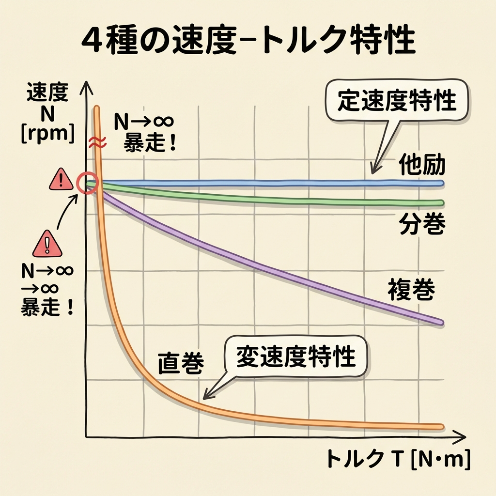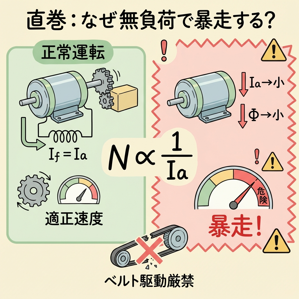• 直巻は無負荷運転厳禁:N ∝ 1/Φ → 負荷が外れるとΦ→0、N→∞で暴走。