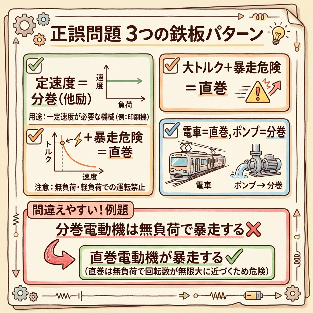 直流電動機の種類と特性は、機械科目の正誤問題・穴埋め問題で毎年のように出題されるテーマです。