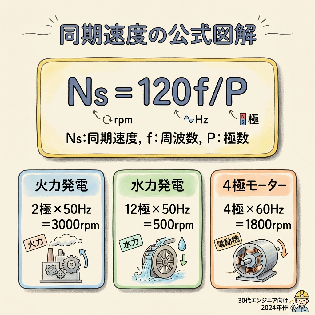 試験では「突極形は水力発電機に使われる」という知識だけでなく、「なぜか」まで問われます。同期速度の式から論理的に導けます。