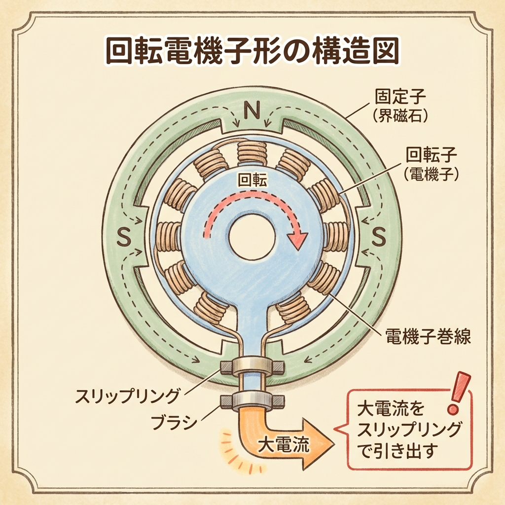 電機子(大電流コイル)が回転するため、スリップリングで大電流を取り出す必要がある