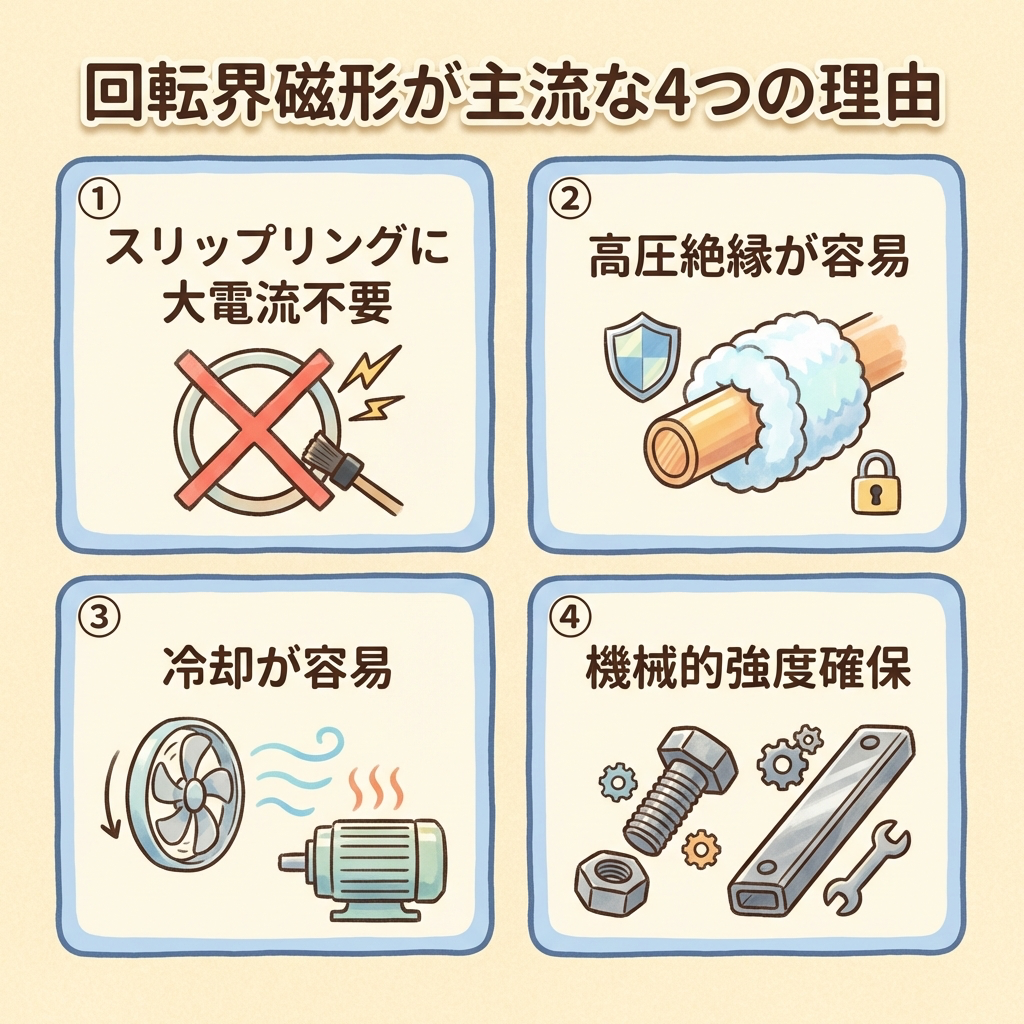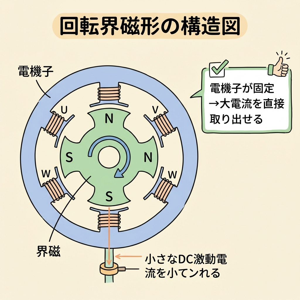 | 回転界磁形が主流 | 電機子(大電流)を固定子に→スリップリング不要・高圧絶縁容易・冷却容易 |
