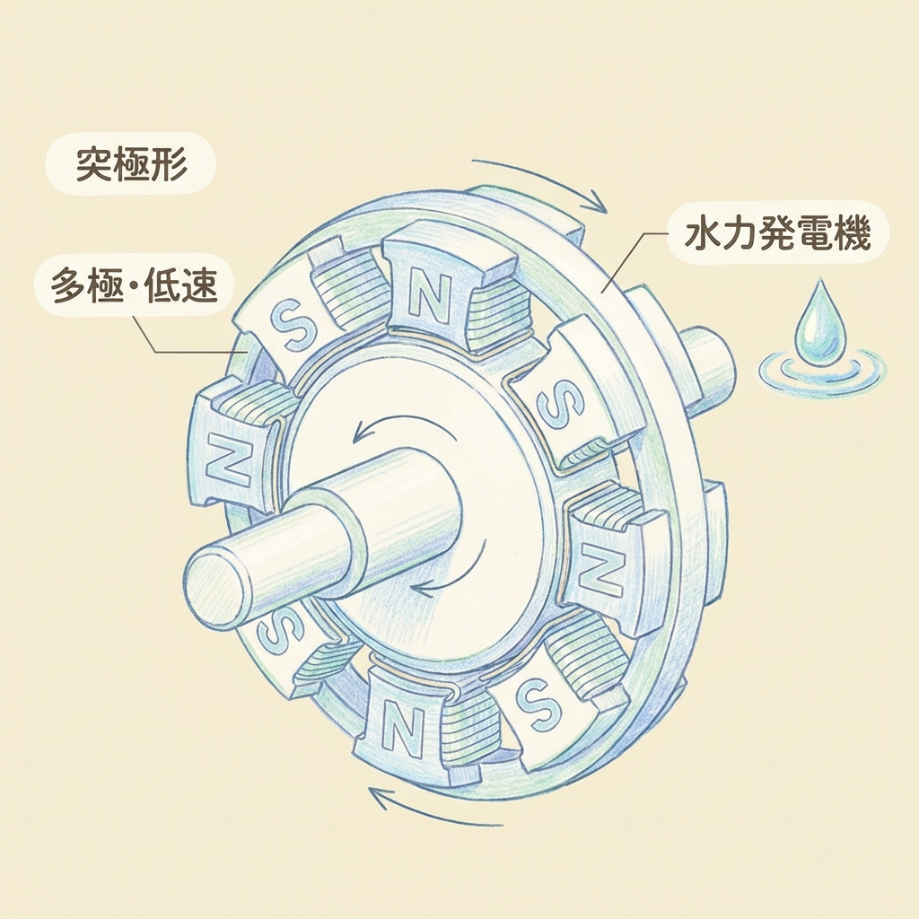 | 突極形 | 多極・低速・扁平形。水力発電機に使用 |