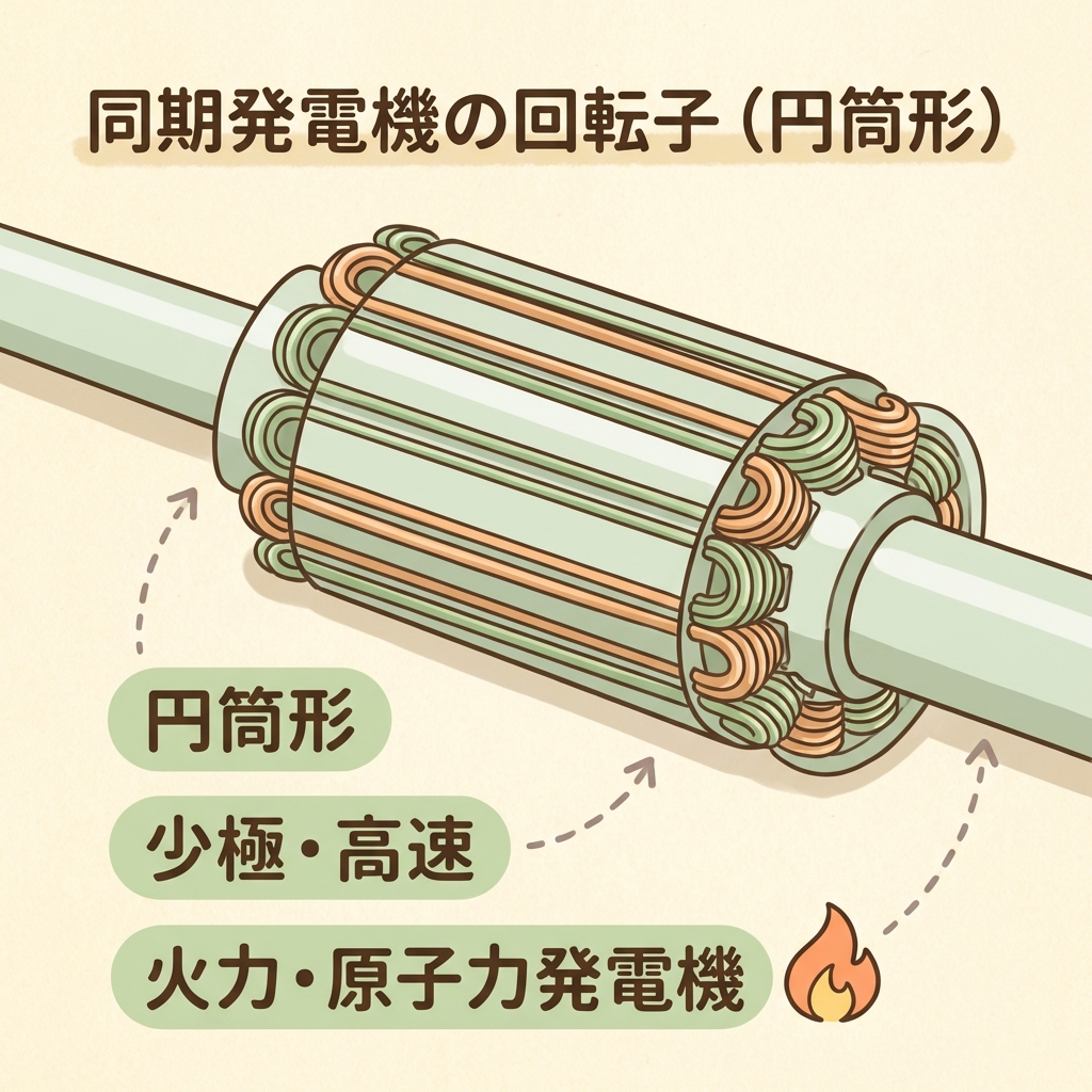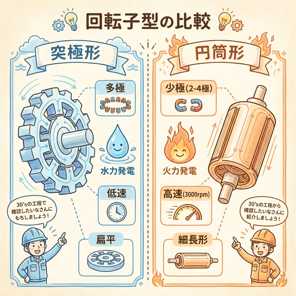 回転界磁形の同期機には、ロータ(界磁)の形状の違いによってさらに2種類があります。試験では「どちらがどの発電所に使われるか」がほぼ毎回出ます。