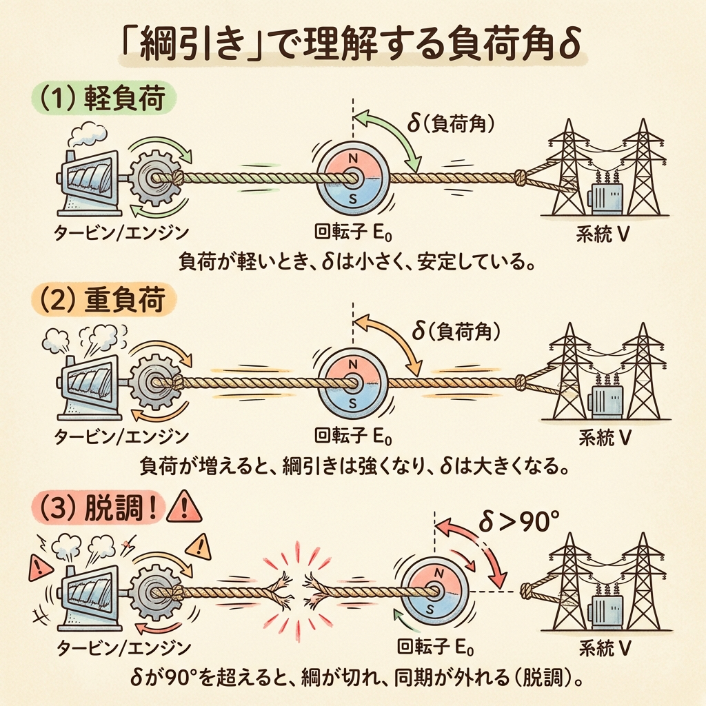δ = 負荷の大きさを表す角度。負荷が大きいほどδは大きくなり、90°で出力最大、90°を超えると同期が外れて脱調する。「綱引きで引っ張りすぎて綱が切れる」イメージです。