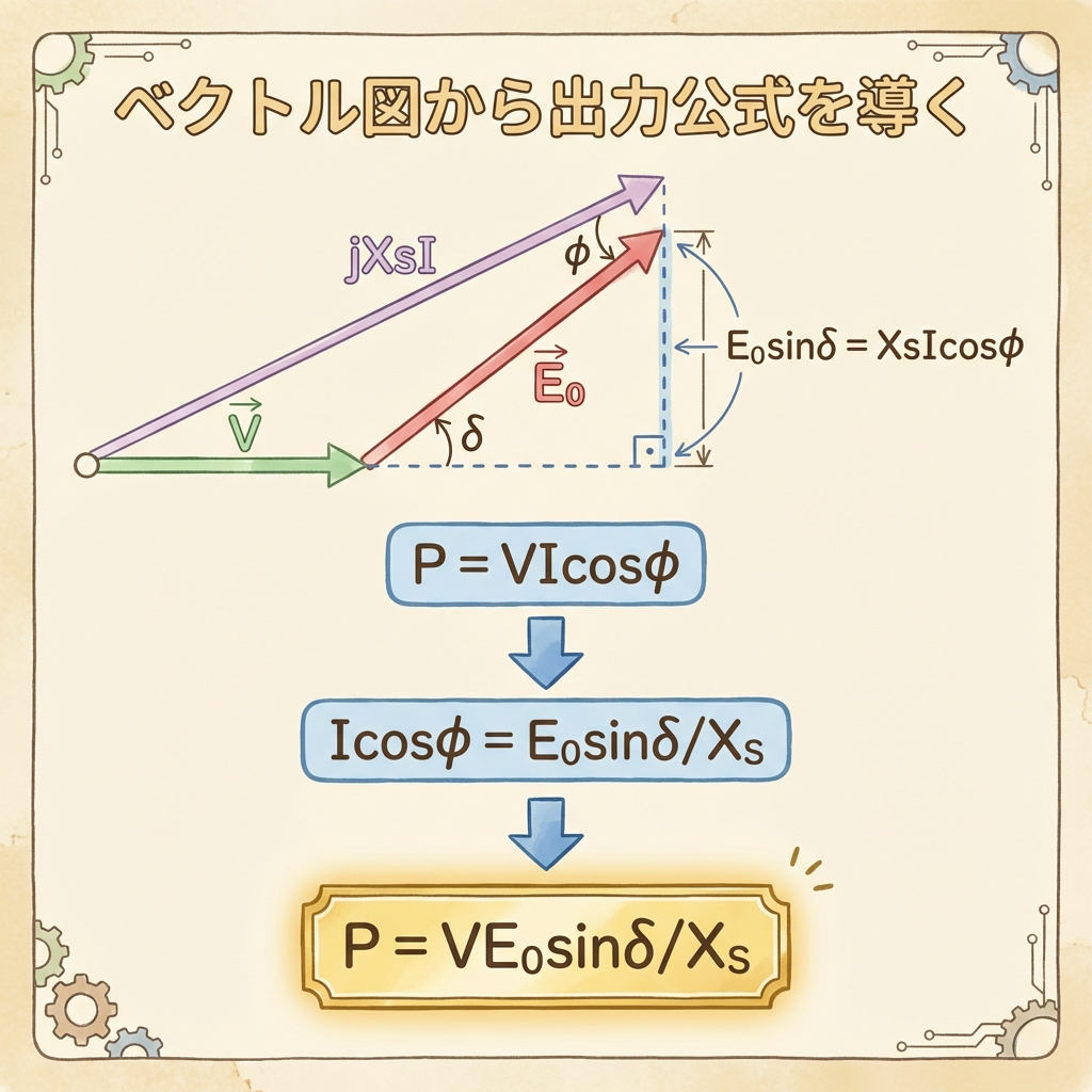 では、出力公式 P = (VE₀/Xs)sinδ をベクトル図を使って導出します。途中式は一切省略しません。