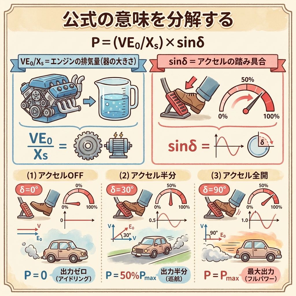 • VE₀/Xs は「器の大きさ(最大出力Pmax)」、sinδ は「使い具合(アクセル)」