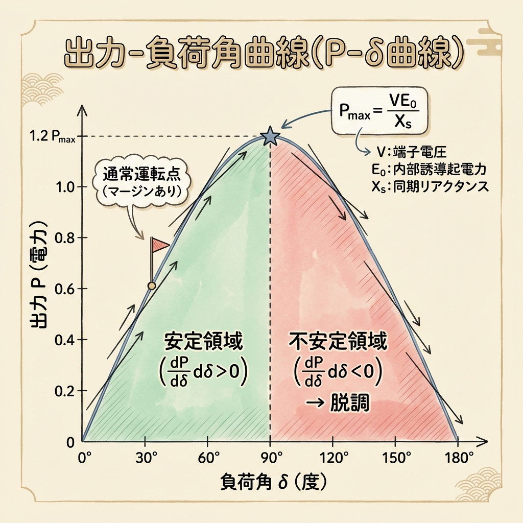 ⚡ 出力-負荷角曲線(P-δ曲線)