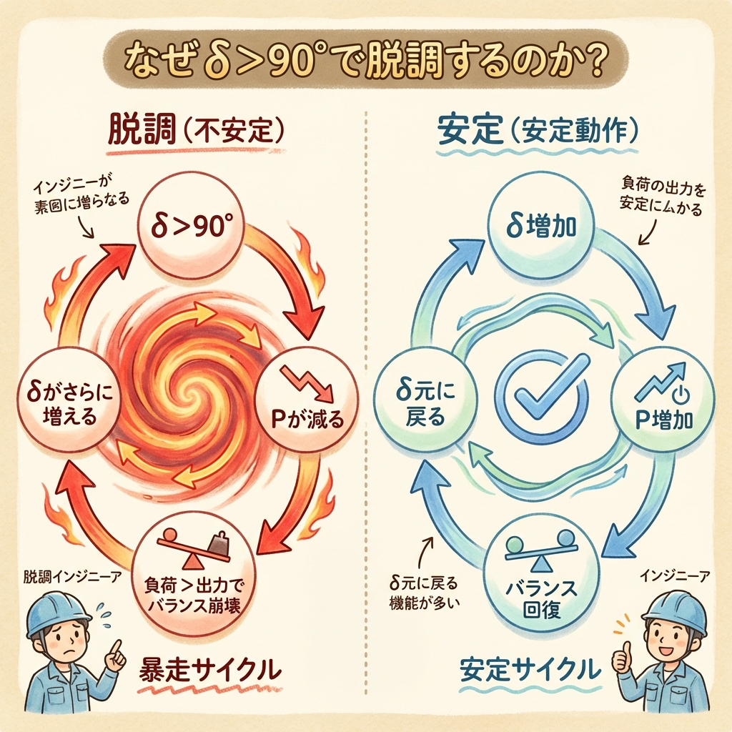 δ > 90° → 出力が減る → 負荷とのバランスが崩れる → δがさらに増える → 正のフィードバック(悪循環)で制御不能 → 同期が外れる