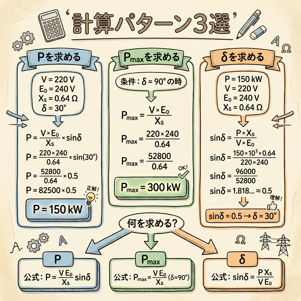 • 出力公式 P = (VE₀/Xs)sinδ をベクトル図から導出(途中式省略なし)