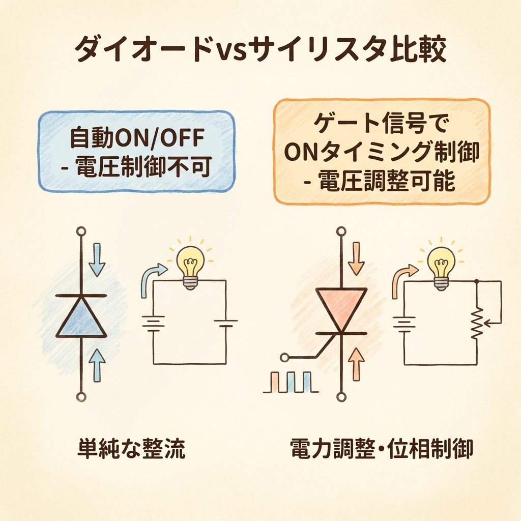 位相制御を理解するには、サイリスタがダイオードと何が違うかを押さえることが出発点です。