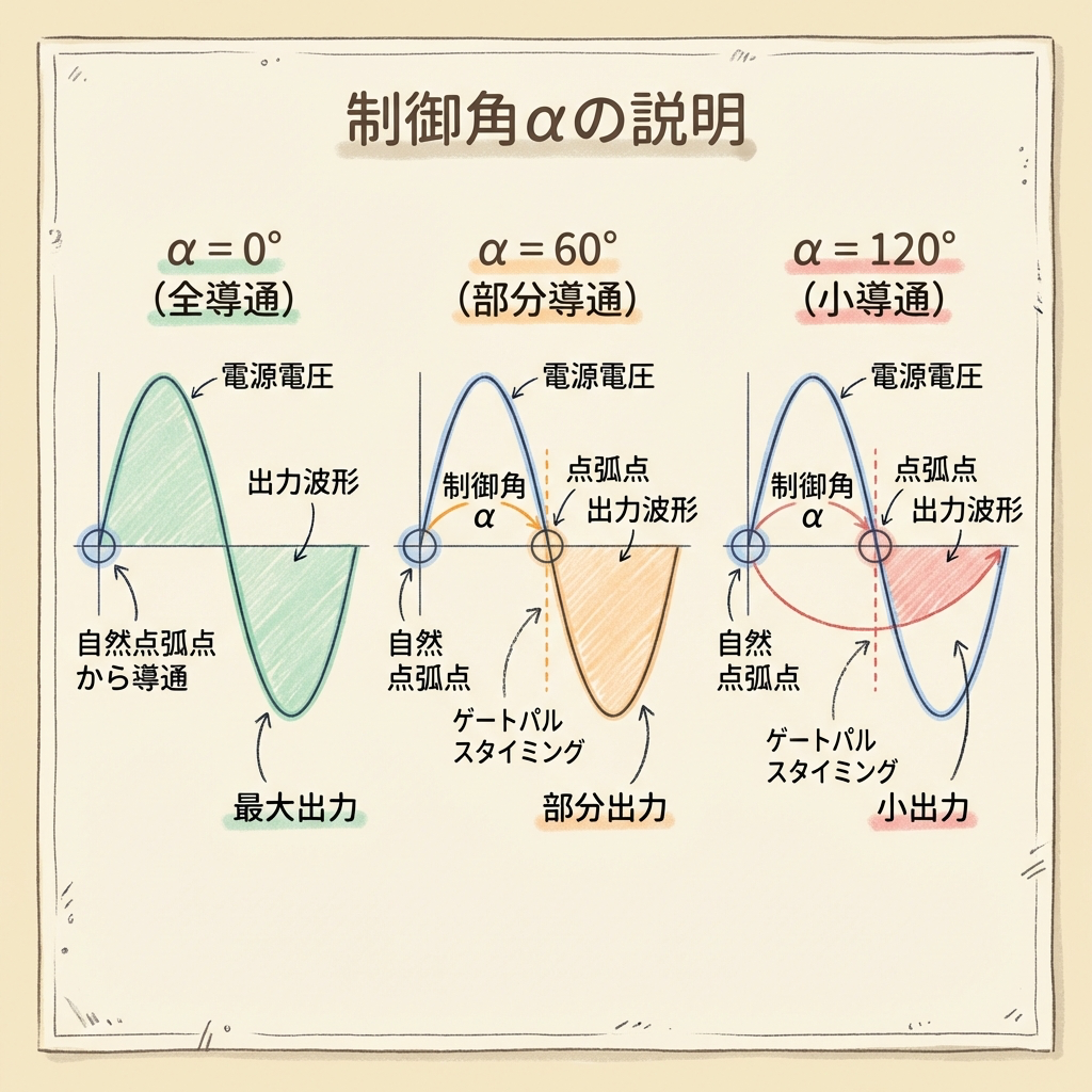 | 制御角αと電圧 | α大きい→出力電圧小。α=0°で最大(ダイオード整流と同じ)。単相全波α=90°でVd=0 |